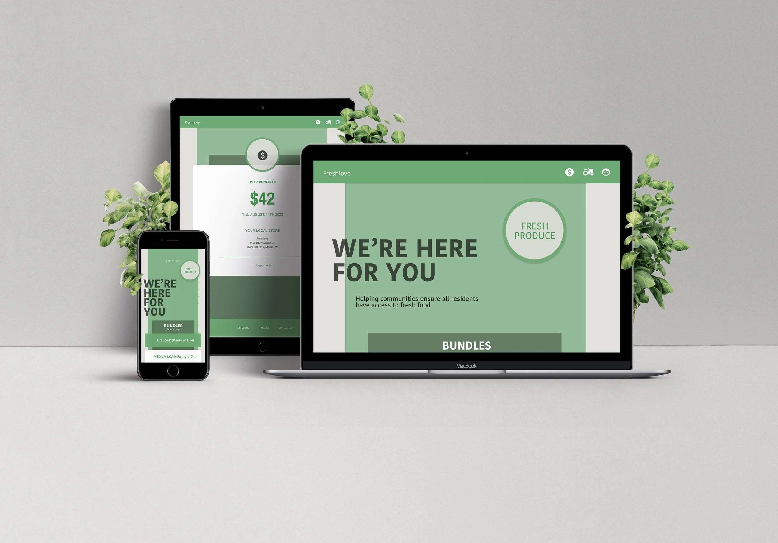 Presented as both an sequential model app and responsive website. This design is geared toward low income families, with the goal of ensuring all local residents have access to fresh food from local farmers’ harvests.
